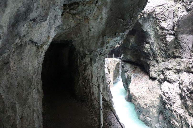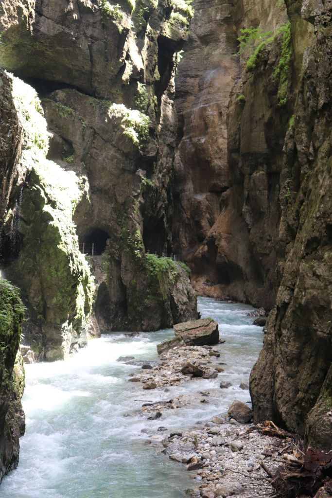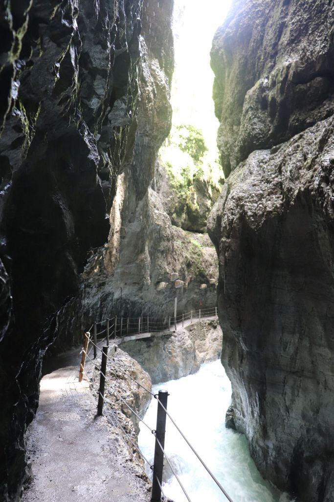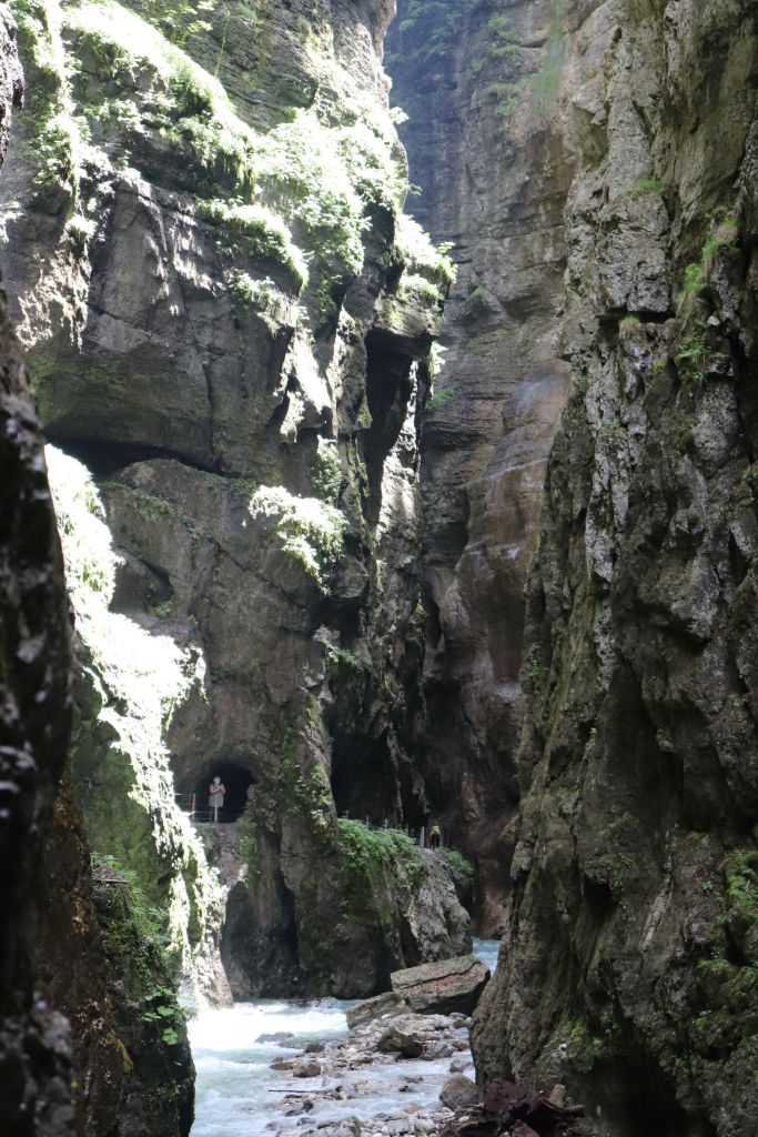 Heutzutage kann auf gesicherten Wegen und Stegen die Partnachklamm durchwandert werden. Es ist kaum vorstellbar, was für eine Kraft die Wassermassen besitzen, welche über Jahrhunderte den Fels geformt, ausgehöhlt und abgetragen haben, sodass dieser eindrucksvoller Ort entstehen konnte. Zwischen bis zu 86 m hohen Felswänden spaziert man teils durch sehr enge Passagen hindurch. Der Weg schlängelt sich entlang kleine Tunnel und verläuft oft unterhalb von Felsvorsprüngen. In den Tunneln kann es sehr dunkel werden und man muss aufpassen, sich nicht den Kopf zu stoßen. Nach jeder Ecke gibt es neue atemberaubende Perspektiven zu entdecken. Die Klänge der schäumenden Partnach ändern sich alle paar Schritte und schaffen eine faszinierende Atmosphäre. Dann ganz plötzlich beruhigt sich der Fluss wieder und man gelangt an einen kleinen Stausee, welcher in den 90er Jahren durch einen Felssturz entstanden ist. Noch heute können die Besucher erahnen, welche rissigen Gesteinsmassen sich hier gelöst haben und welche unvorstellbare Kraft die Natur doch hat. Es ist genau der richtige Ort, um eine Minute inne zu halten, bevor der Weg über eine Treppe hinaus aus der Klamm führt.