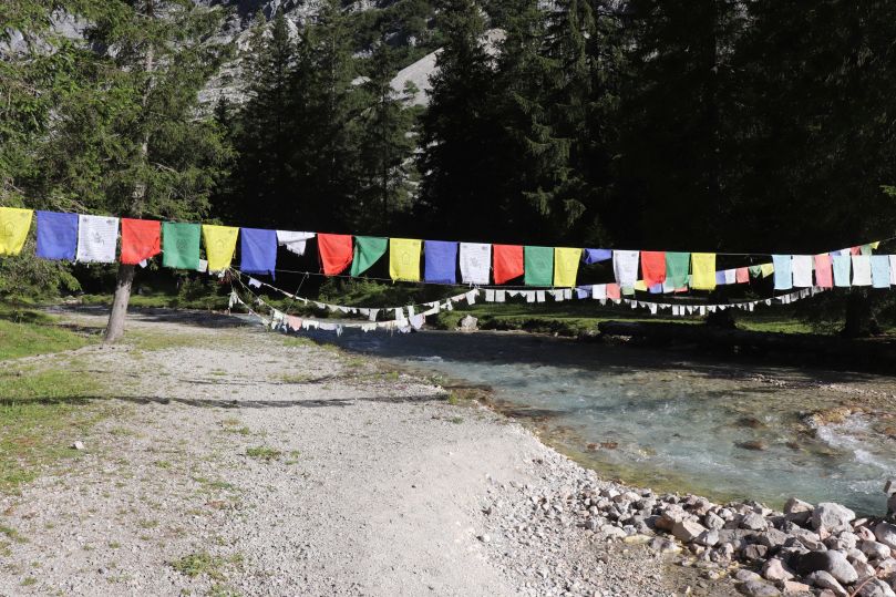 Nach der Bockhütte verengt sich der Pfad, welcher weiterhin parallel zur Partnach führt. Der Weg entlang des Tals ist noch weittestgehend naturbelassen. Aufgrund seiner abgelegenen Lage führen hier nur wenige schmale Wege entlang. Vor einigen Jahren konnte man auf dem Pfad die „Blauen Gumpen“ bewundern , zwei wunderschöne Bergseen die zu einem Päuschen einluden. 2005 führten starke Niederschläge zu Murenabgängen, welche die Blauen Gumpen zerstörten. Heute ist dort, wo einst die 2 Bergseen lagen nur noch Geröll zu entdecken. Schon von weiten hört man den höchsten Wasserfall der Partnach. Direkt aus einer Klamm donnert hier das Wasser 80 m in die Tiefe. Der Wanderweg führt steil hinauf und am Wasserfall vorbei. Kurz davor kommt man an von der Natur geschaffenen Badewannen vorbei. Wenn es vor kurzem geregnet hat kann man hier in der Natur eine kleine Abkühlung genießen. Wenn das Wasser in den Wannen allerdings schon länger steht, sollte man von dem Vergnügen lieber absehen. Von hieraus ist es nicht mehr weit bis zu dem Tagesziel der meisten Wanderer. Durch die tibetischen Gebetsfahnen, welche über den Fluss gespannt sind, ist die Reintalangerhütte schwer zu verwechseln. Aufgrund der immer karger werdende Landschaft und der steinigen Gebirgsspitzen, kommt man sich sogar fast so vor, als würde man direkt in Tibet stehen.