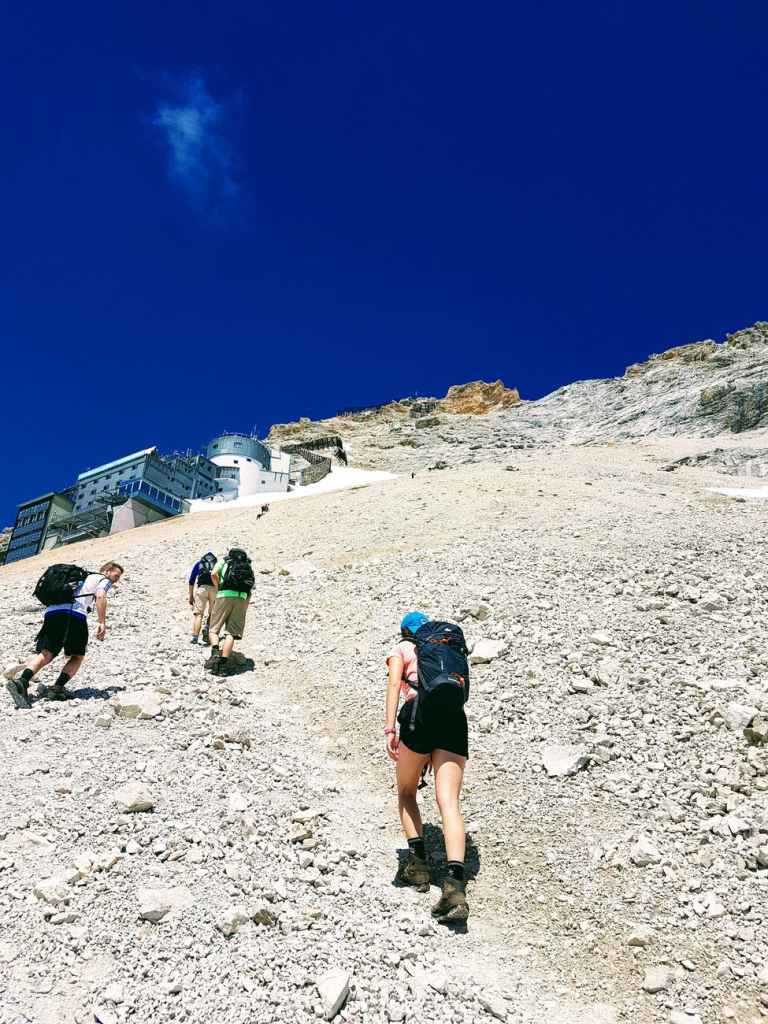 Die letzten 300 hm bis zur Spitze sind die anstrengendsten der ganzen Wanderung. Erst durch steiles Geröll und dann über Felsstufen am Drahtseilen gesichert über den Südgrat bis hin zum Gipfel. Die letzten 200 hm können auch mit der Gletscherbahn vom SonnAlpin gefahren werden. Der höchsten Punkt Deutschlands mit 2962 m ist der Ostgipfel. Dieser ist von der Besucherplatzform am Westgipfel durch einen kurzen „Klettersteig“ erreichbar.